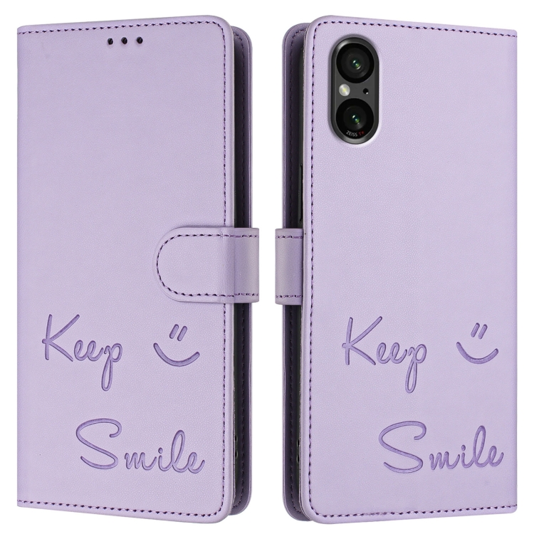 Funda de Cuero Rfid para Sony Xperia 5 Vi con Relieve Sonriente (Morado Claro)