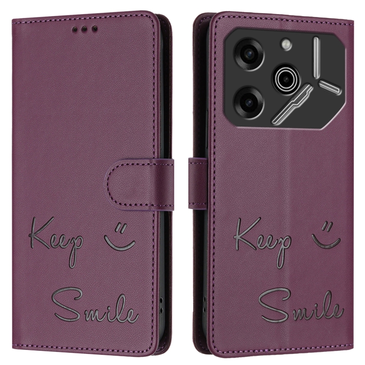 Funda de Cuero Rfid con Relieve Sonriente para Tecno Pova 6 Pro/Pova 6 5G (Violeta)
