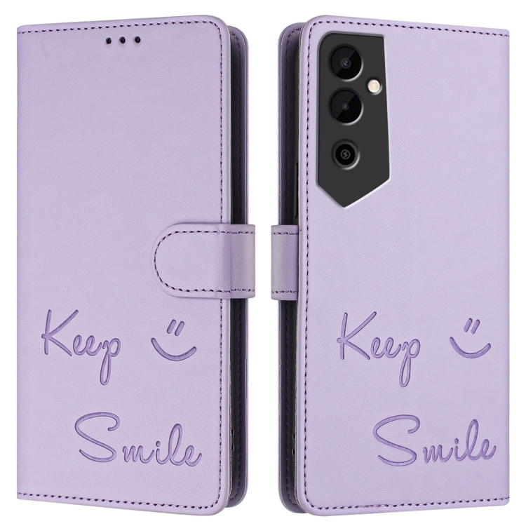 Funda de Cuero Rfid para Tecno Pova Neo 2 con Relieve Sonriente (Morado Claro)