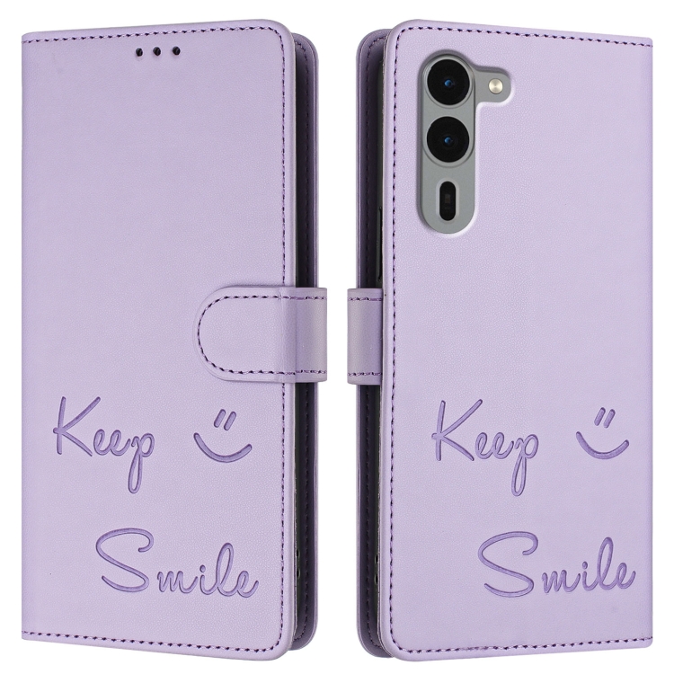 Funda de Cuero Rfid con Relieve Sonriente para Teléfono Fujitsu Arrows We2 Plus (Morado Claro)