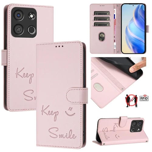 Funda de Cuero Rfid con Relieve Sonriente para Teléfono Itel A05S (Rosa)