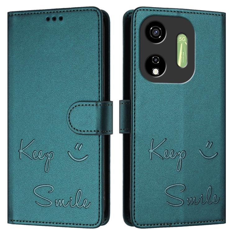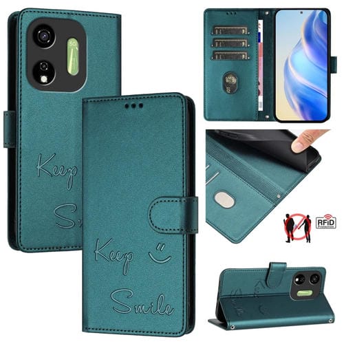 Funda de Cuero Rfid con Relieve Sonriente para Teléfono Itel P55 5G (Verde Pavo Real)
