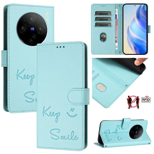 Funda de Cuero Rfid con Relieve Sonriente para Vivo X100 Pro 5G (Verde Menta)