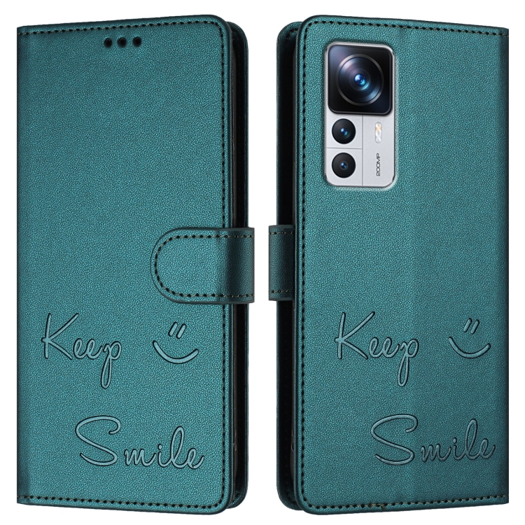 Funda de Cuero Rfid con Relieve Sonriente para Xiaomi 12T/12T Pro (Verde Pavo Real)