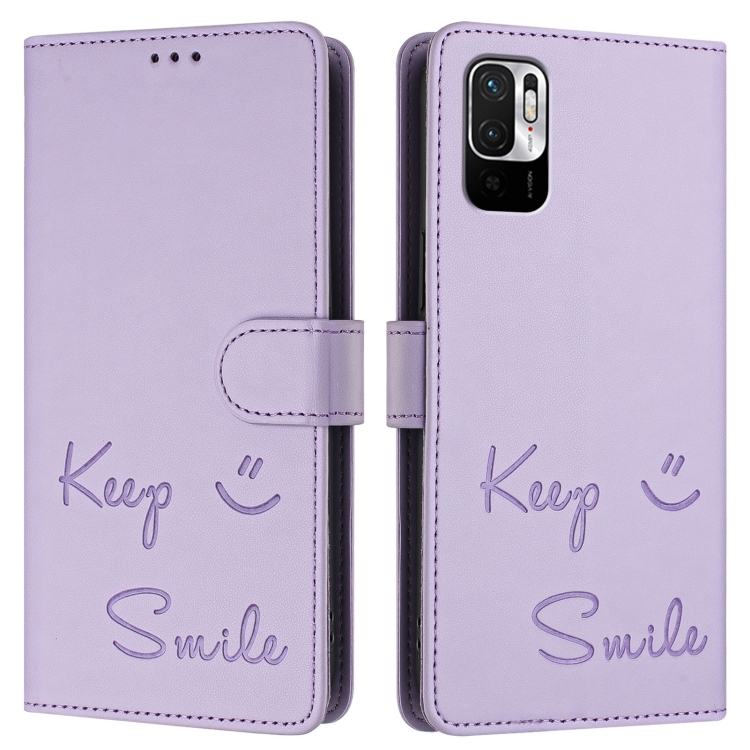 Funda de Cuero Rfid con Relieve Sonriente para Xiaomi Poco M3 Pro (Morado Claro)