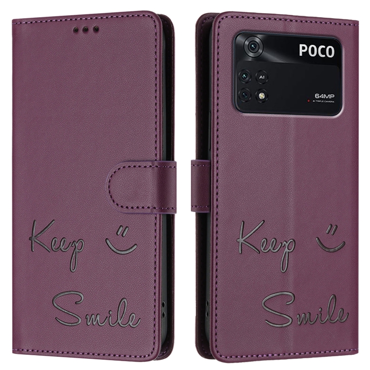 Funda de Cuero Rfid con Relieve Sonriente para Xiaomi Poco M4 Pro 4G (Violeta)