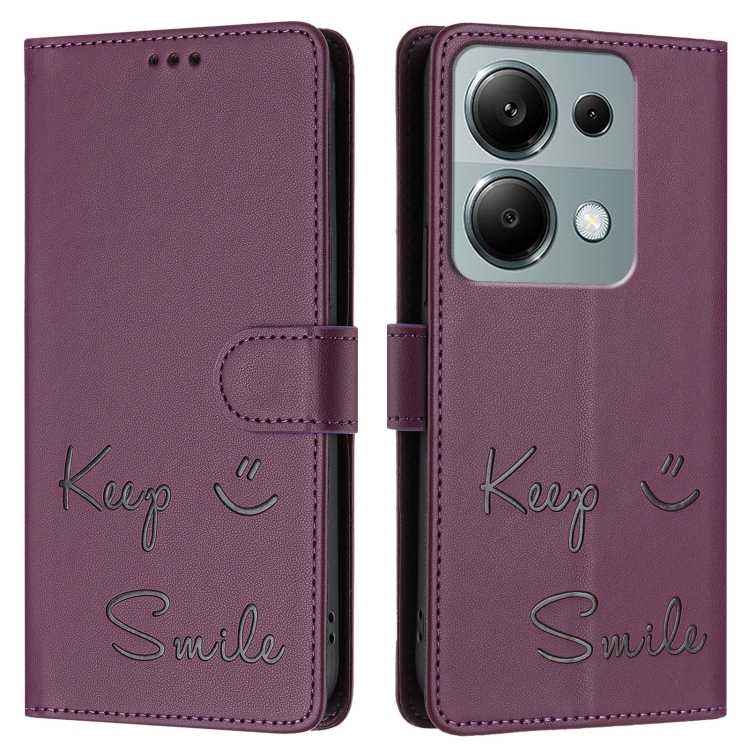 Funda de Cuero Rfid con Relieve Sonriente para Xiaomi Poco M6 Pro 4G (Violeta)