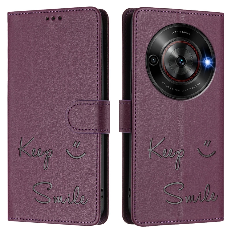 Funda Cuero Rfid con Relieve Sonriente para ZTE Blade A75 5G (Violeta)