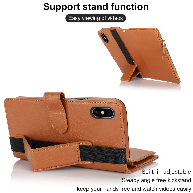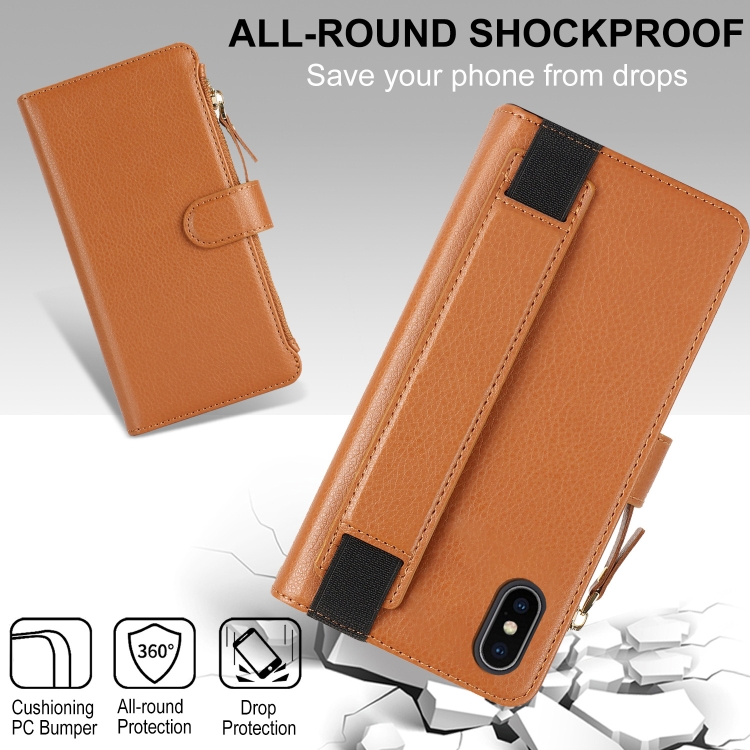 Funda de Cuero Rfid para iPhone Xs Max con Cierre de Cremallera y Soporte para Pulsera (Marrón)