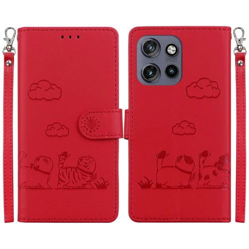 Funda de Cuero RFID para Motorola Edge 50 Neo 5G con Diseño de Gatos (Rojo)