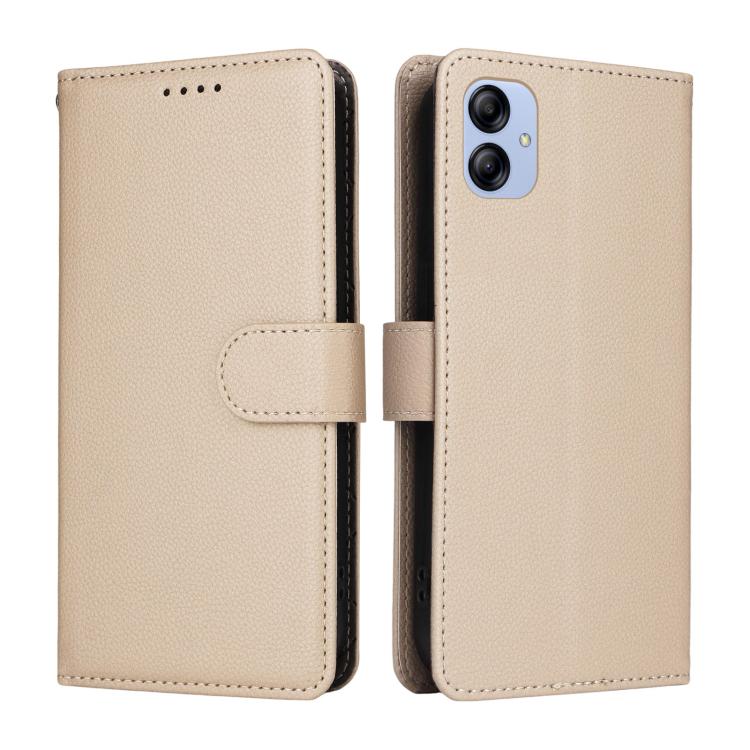 Funda de cuero tipo billetera con bloqueo RFID para Samsung Galaxy A04e 4G/F04, con textura Litchi y capacidad para 3 tarjetas (beige)
