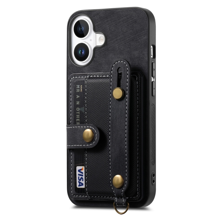 Funda de Cuero Tipo Billetera para iPhone 16 Plus con Correa Cruzada Retro (Negro)