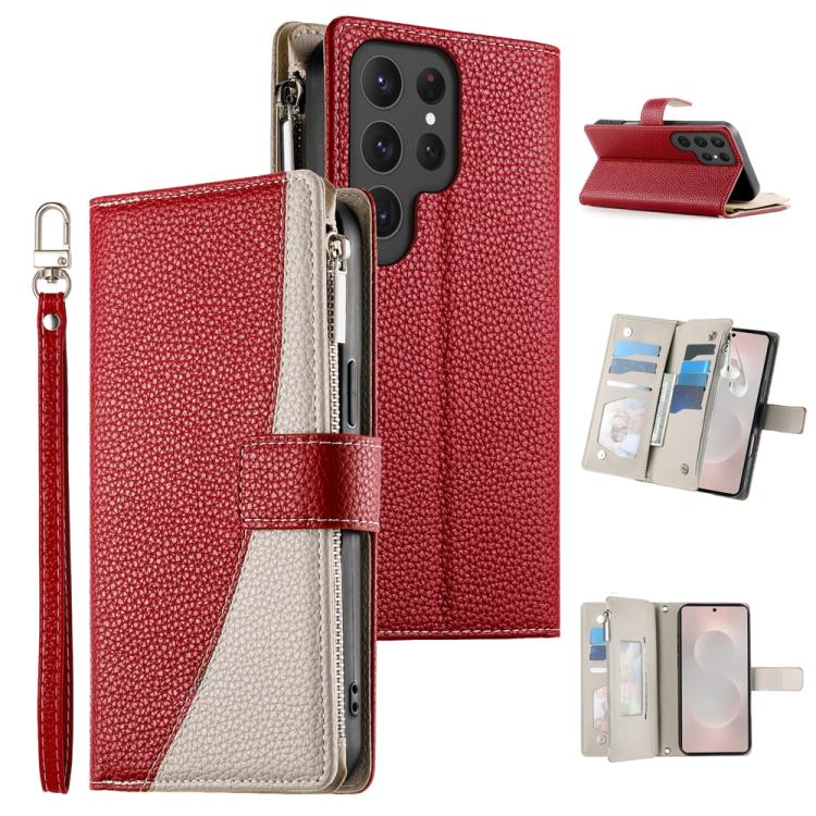 Funda de cuero tipo billetera con cremallera para Samsung Galaxy S25 Ultra 5G, con costuras, múltiples tarjetas y correa corta (roja)