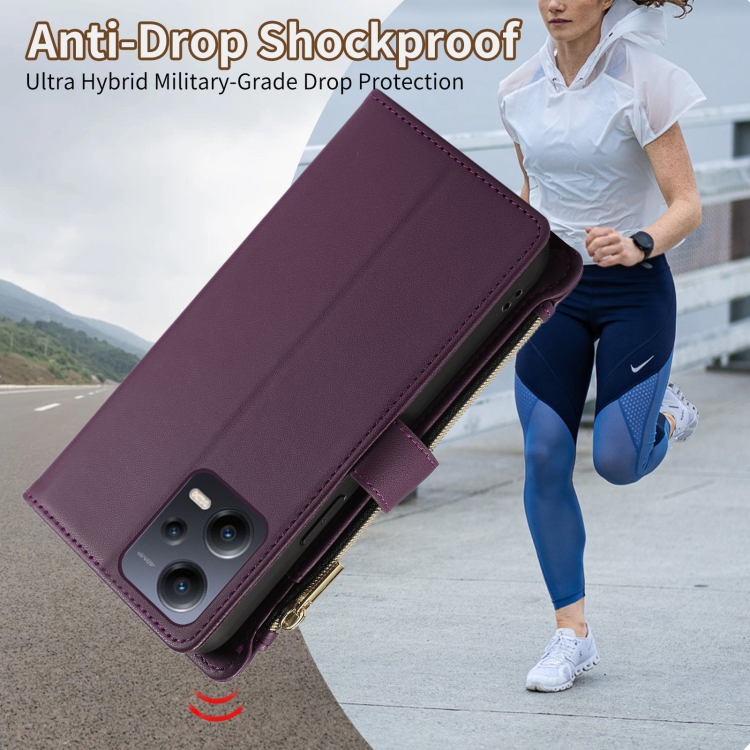 Funda de Cuero Tipo Billetera con Cremallera Rombal Global para Redmi Note 12 5G (Morado Oscuro)