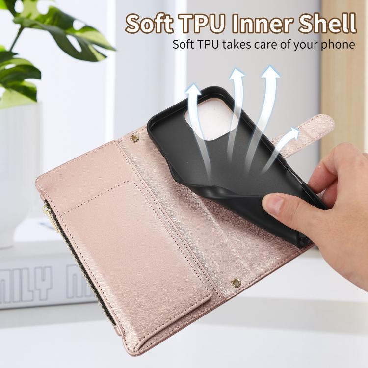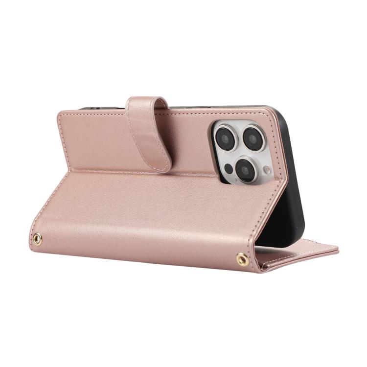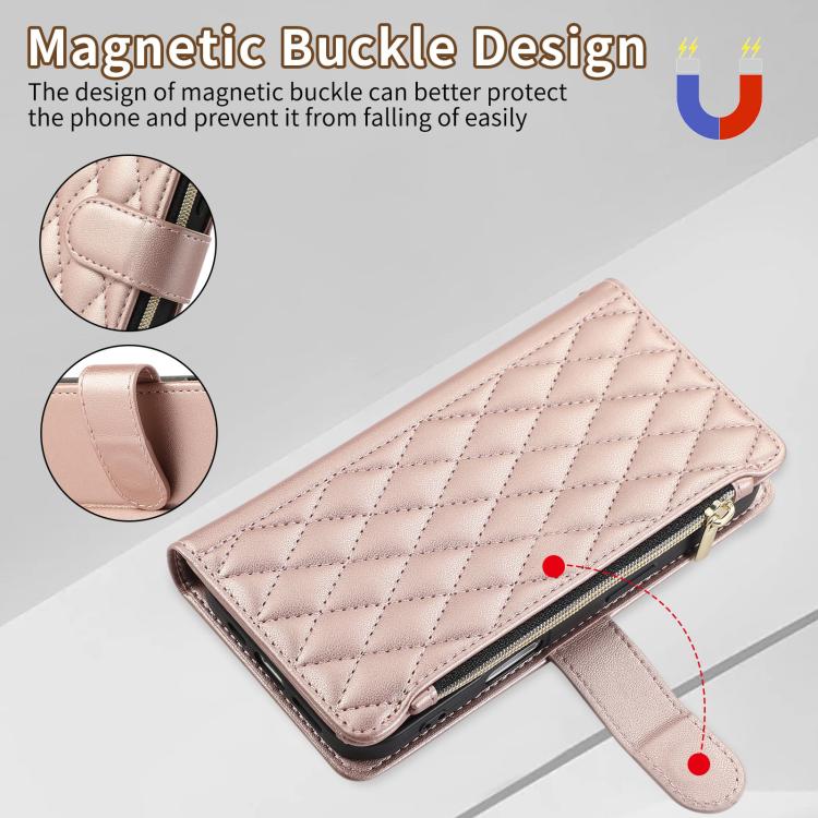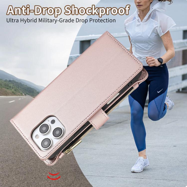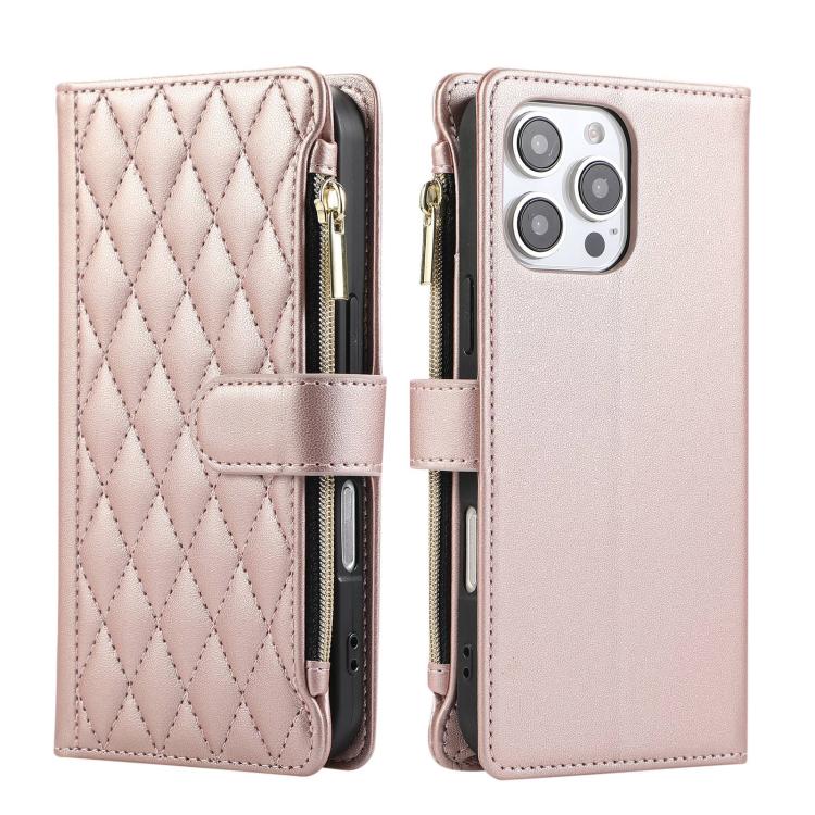 Funda de Cuero Tipo Billetera con Cremallera Rombal para iPhone 16 Pro Max (Oro Rosa)