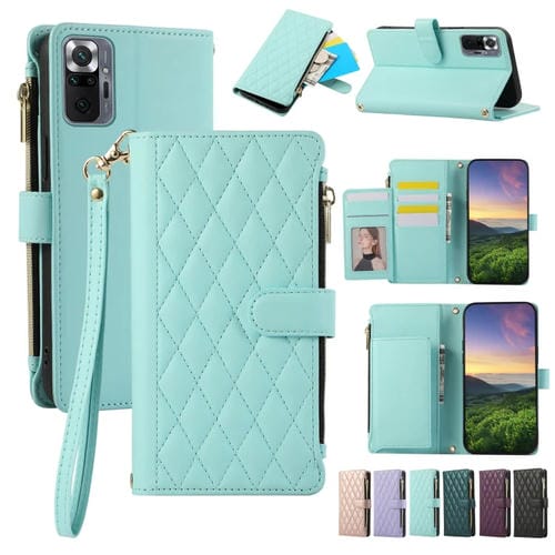 Funda de Cuero Tipo Billetera con Cremallera Rombal para Redmi Note 10 Pro/10 Pro Max (Cian)