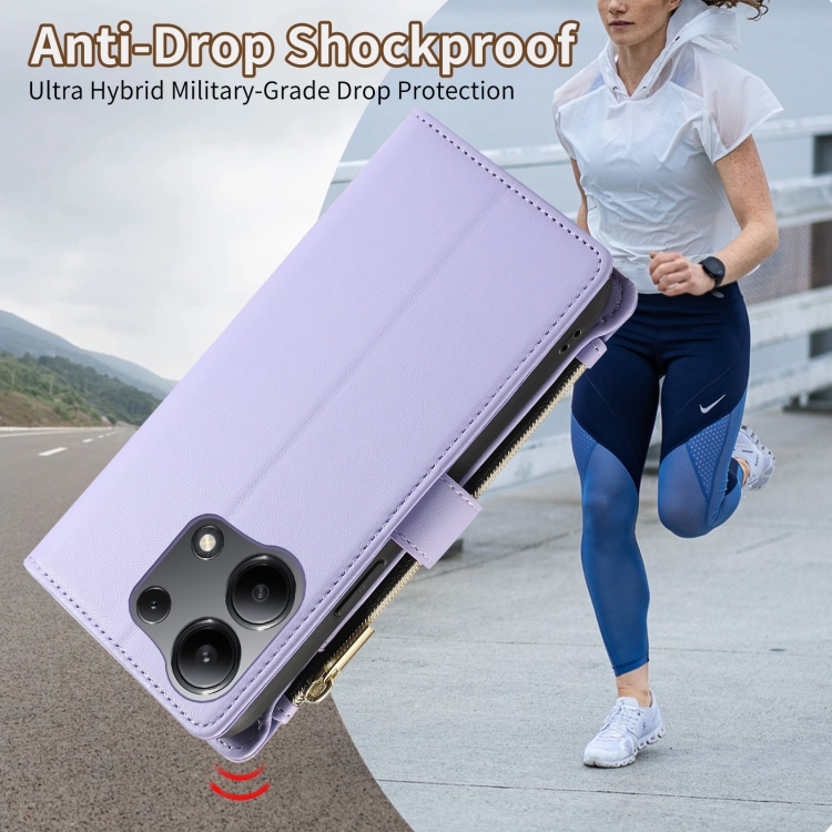 Funda de Cuero Tipo Billetera con Cremallera Rombal para Redmi Note 13 4G (Morado)