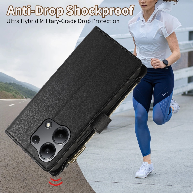 Funda de Cuero Tipo Billetera con Cremallera Rombal para Redmi Note 13 4G (Negra)