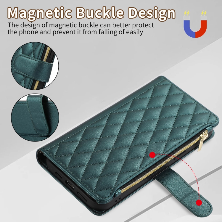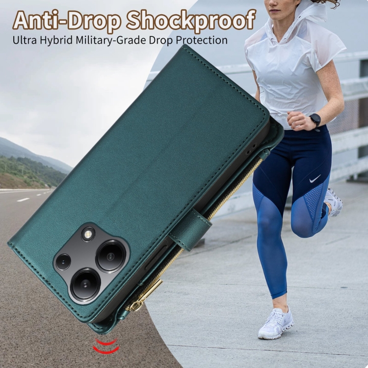 Funda de Cuero Tipo Billetera con Cremallera Rombal para Redmi Note 13 4G (Verde)