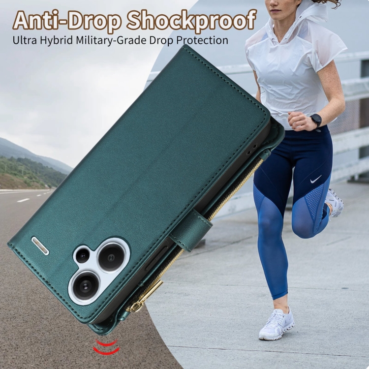 Funda de Cuero Tipo Billetera con Cremallera Rombal para Redmi Note 13 Pro+ 4G/5G (Verde)
