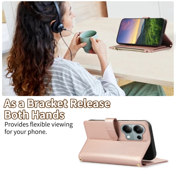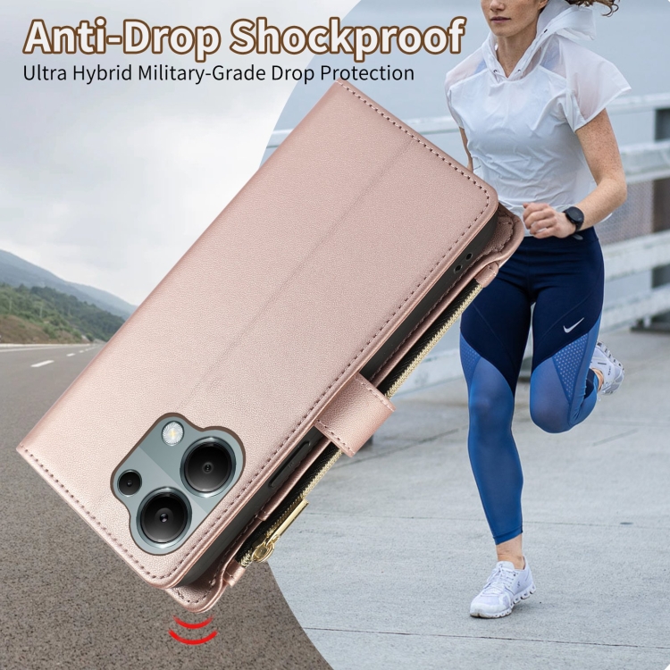 Funda de Cuero Tipo Billetera con Cremallera Rombal para Redmi Note 13 Pro 4G (Oro Rosa)