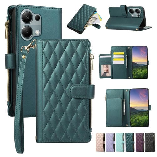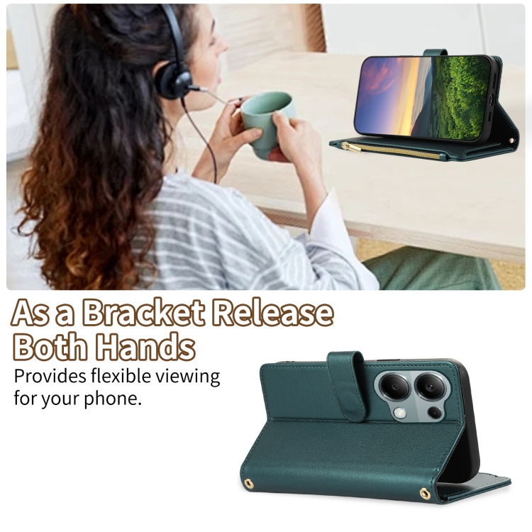 Funda de Cuero Tipo Billetera con Cremallera Rombal para Redmi Note 13 Pro 4G (Verde)