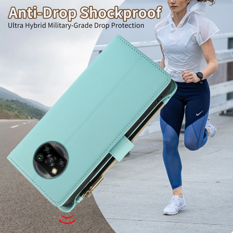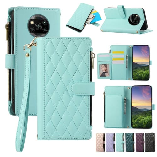 Funda de Cuero Tipo Billetera con Cremallera Rombal para Xiaomi Poco X3 Nfc (Cian)