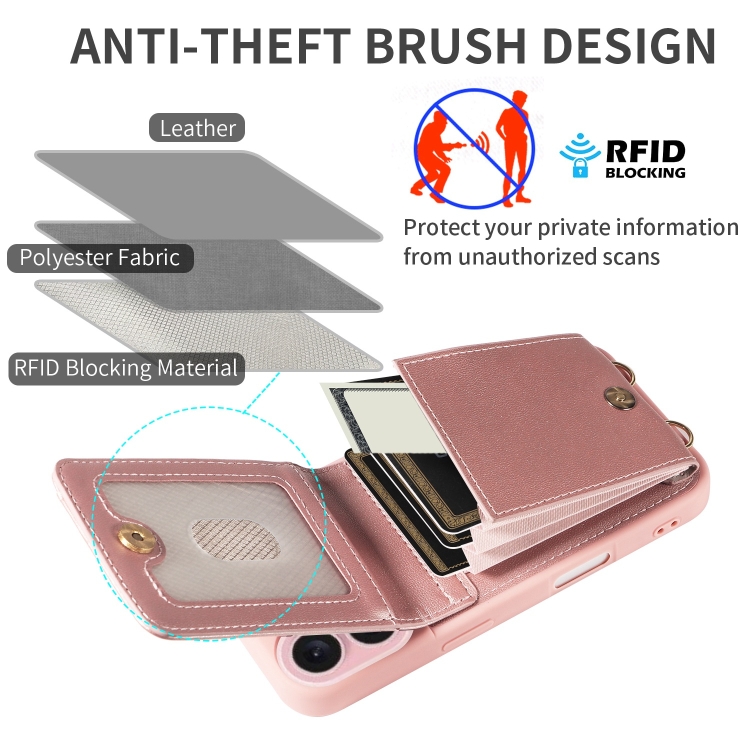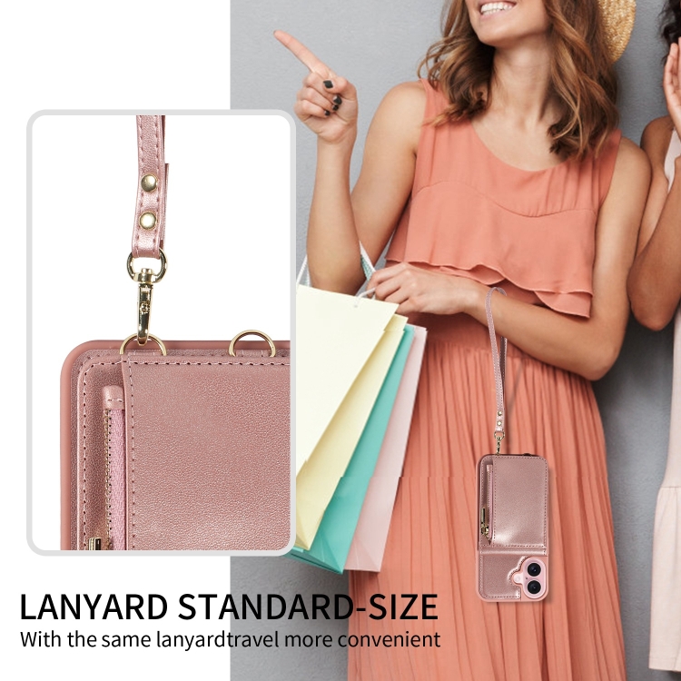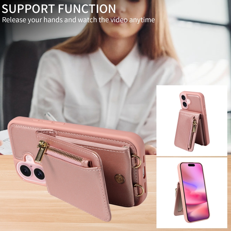 Funda de Cuero Tipo Billetera con Cremallera y Cordón Cruzado para iPhone 16 (Oro Rosa)