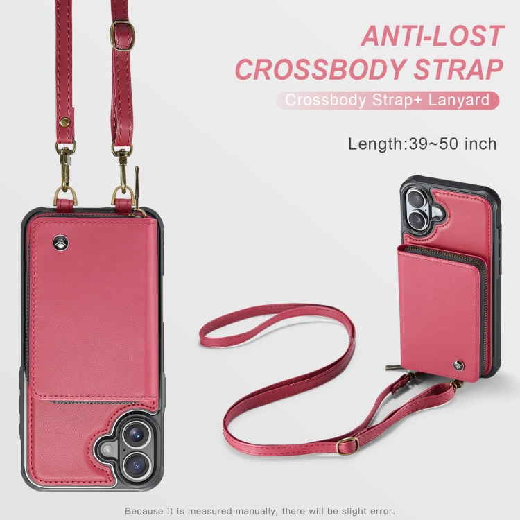 Funda Tipo Billetera Jeehood C22 para iPhone 16 Plus con Cremallera y Cordón Doble (Rojo)