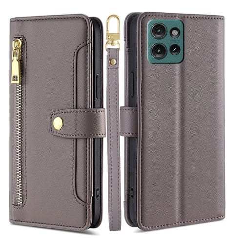 Funda de Cuero Tipo Billetera para Motorola Edge 50 5G con Cremallera y Textura de Oveja (Gris)