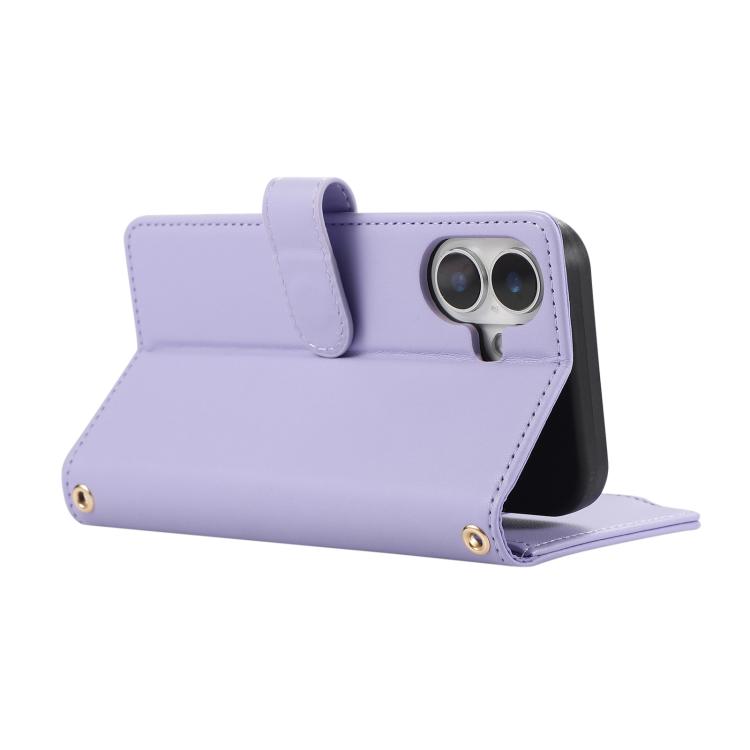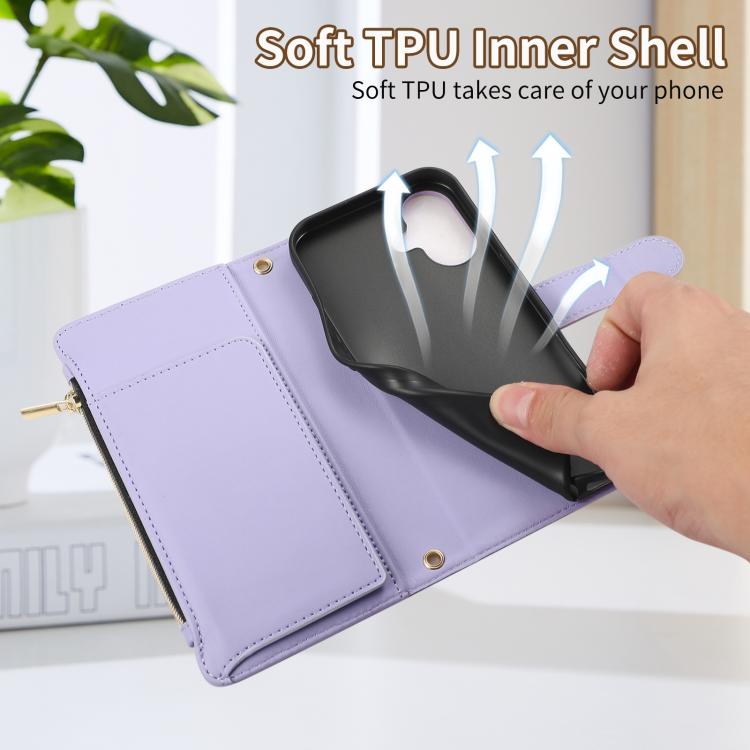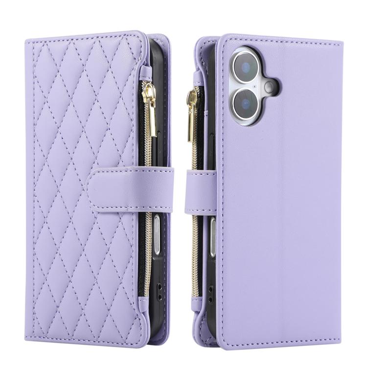 Funda Tipo Billetera Cuero con Cremallera y Diseño Rombal para iPhone 16 (Morado)