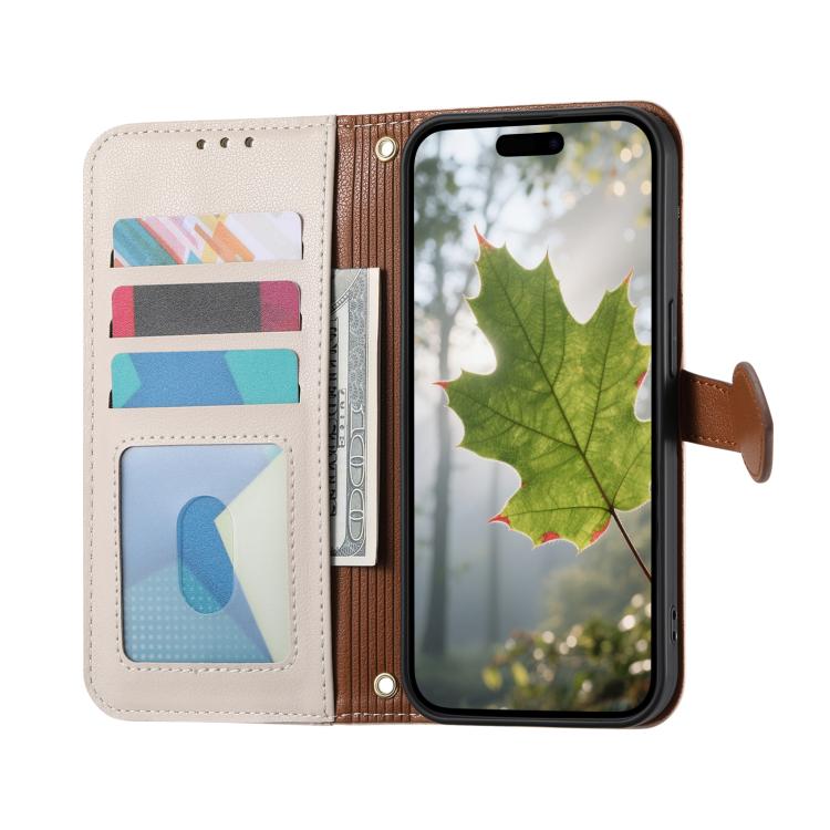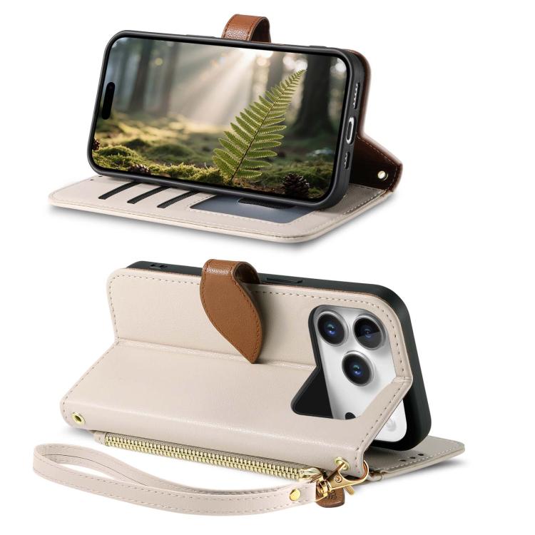 Funda de cuero tipo billetera con cremallera y hebilla de hoja para iPhone 17 Pro (blanco roto)
