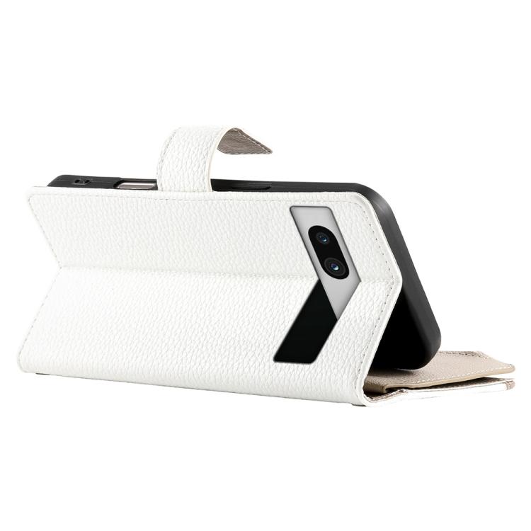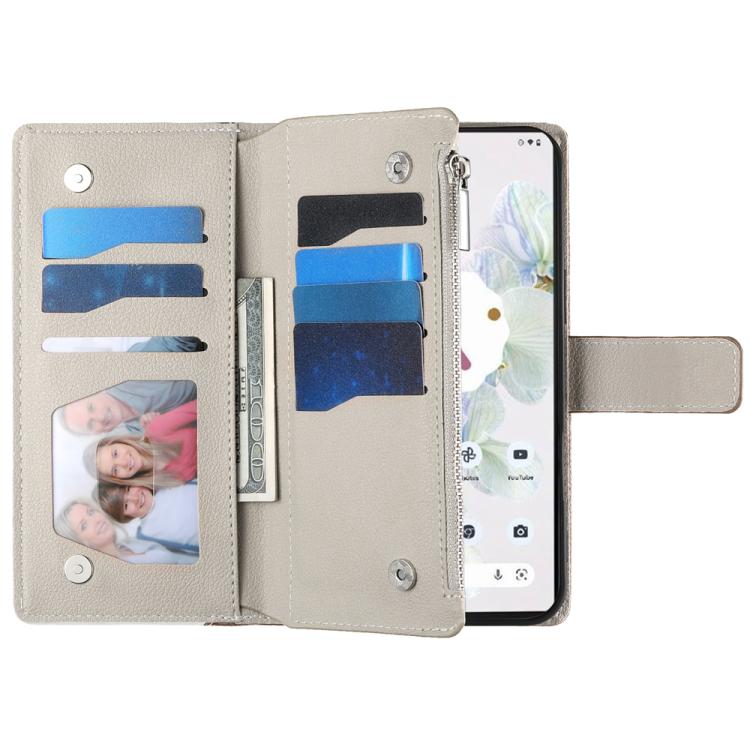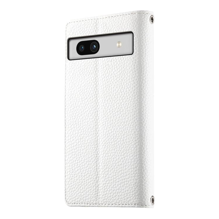Funda de cuero tipo billetera con cremallera y múltiples tarjetas para Google Pixel 7a, con costuras y correa corta (blanca)