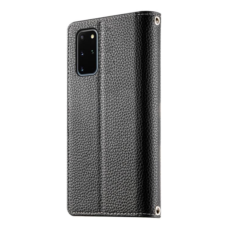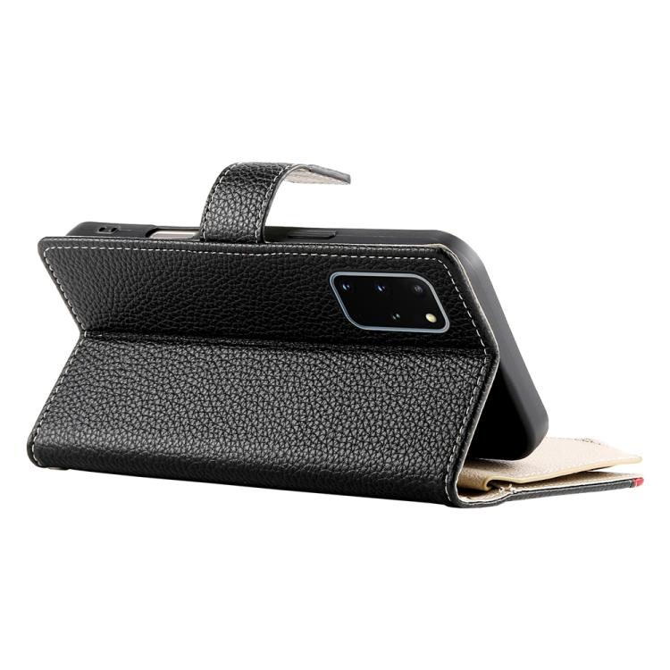 Funda de cuero tipo billetera con cremallera y múltiples tarjetas para Samsung Galaxy S20+ con costuras y correa corta (negra)