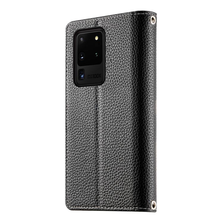 Funda de cuero tipo billetera con cremallera y múltiples tarjetas para Samsung Galaxy S20 Ultra con costuras y correa corta (negra)