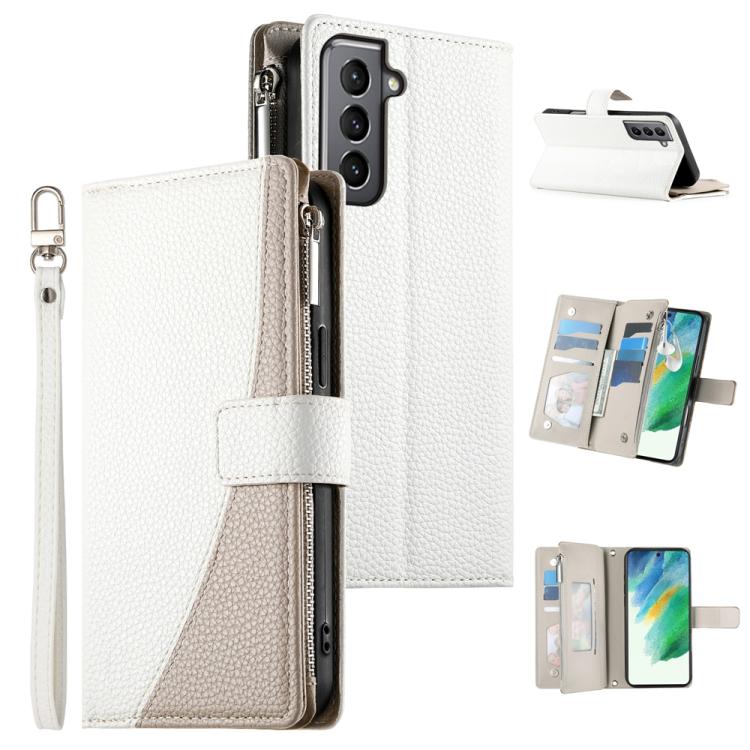 Funda de cuero tipo billetera con cremallera y múltiples tarjetas para Samsung Galaxy S21 5G, con costuras y correa corta (blanca)