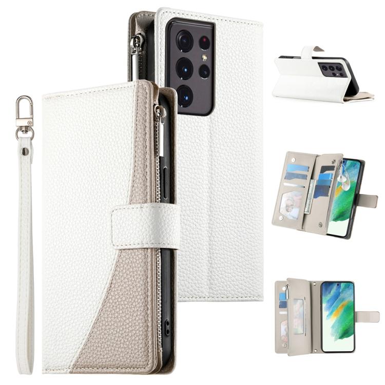 Funda de cuero tipo billetera con cremallera y múltiples tarjetas para Samsung Galaxy S21 Ultra 5G, con costuras y correa corta (blanca)