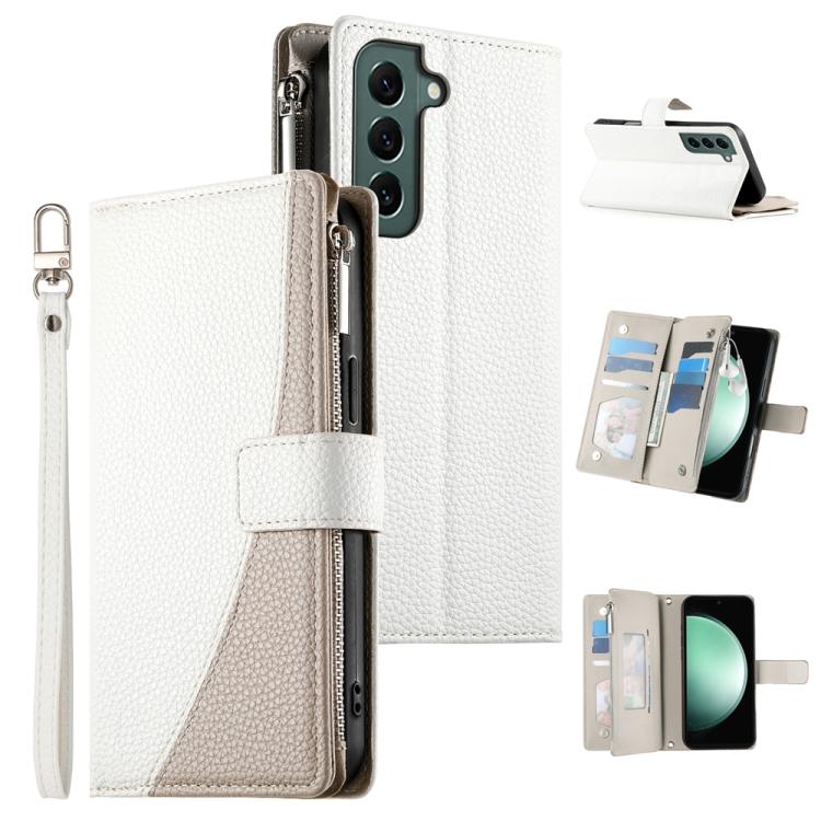 Funda de cuero tipo billetera con cremallera y múltiples tarjetas para Samsung Galaxy S22+ 5G, con costuras y correa corta (blanca)