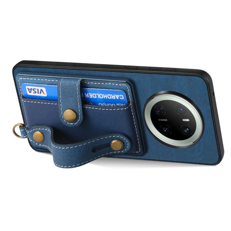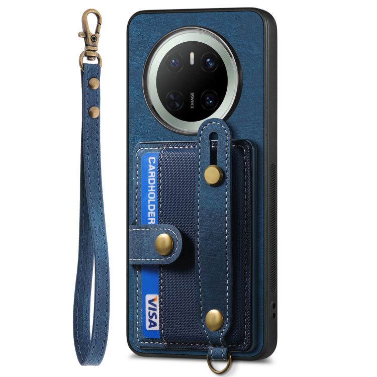 Funda de Cuero Tipo Billetera para Huawei Mate 70 Pro con Diseño Retro y Pulsera Cruzada (Azul)