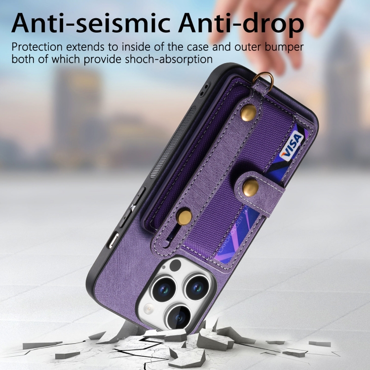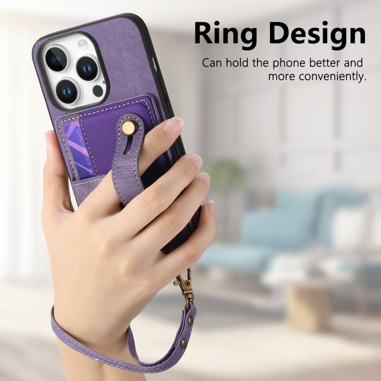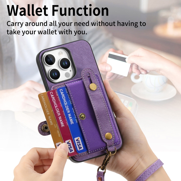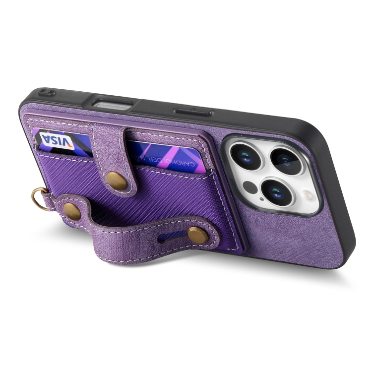 Funda Tipo Billetera Cuero Diseño Retro Pulsera Cruzada para iPhone 16 Pro Max (Morado)