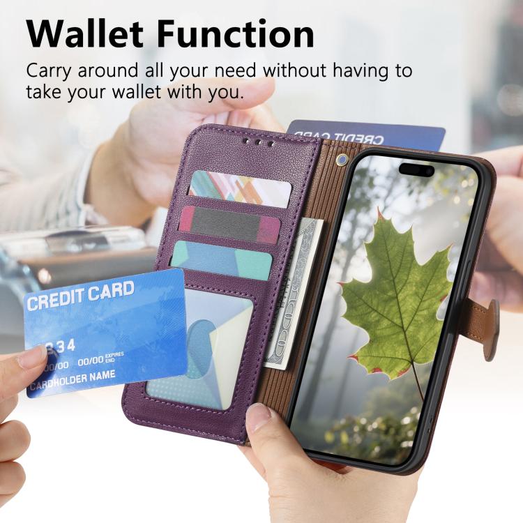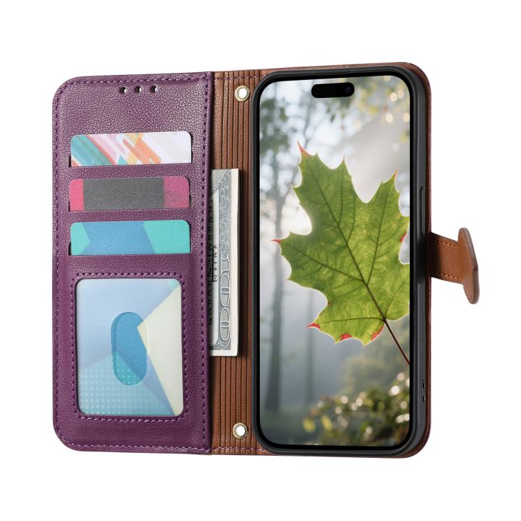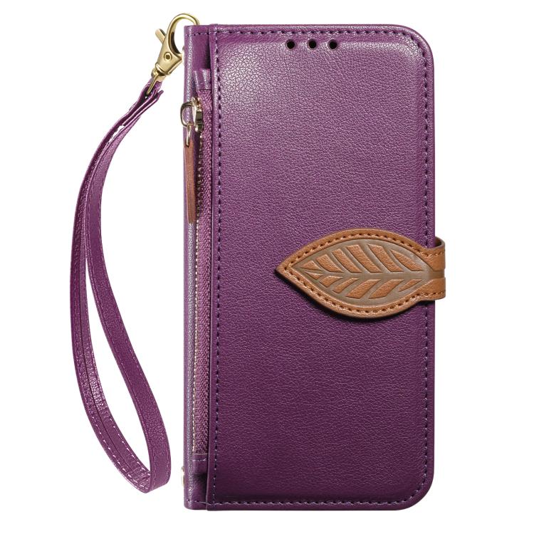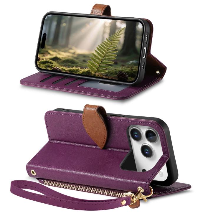 Funda de cuero tipo billetera con hebilla de hoja y cremallera para iPhone 17 Pro (morado)