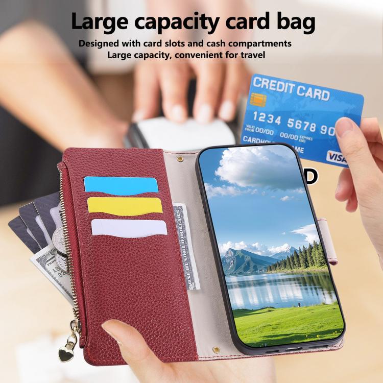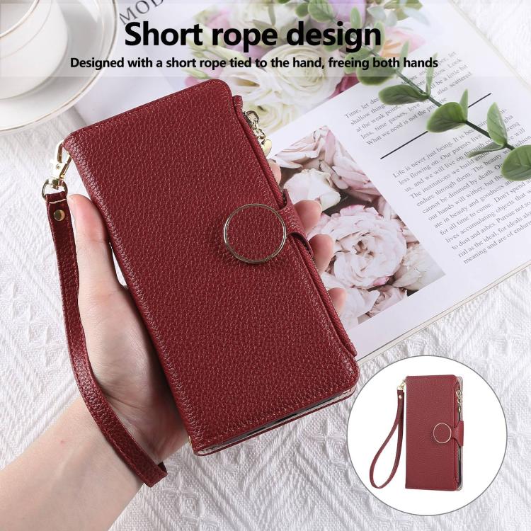 Funda de cuero tipo billetera con hebilla redonda y cremallera para Redmi 13C con correa cruzada (roja)