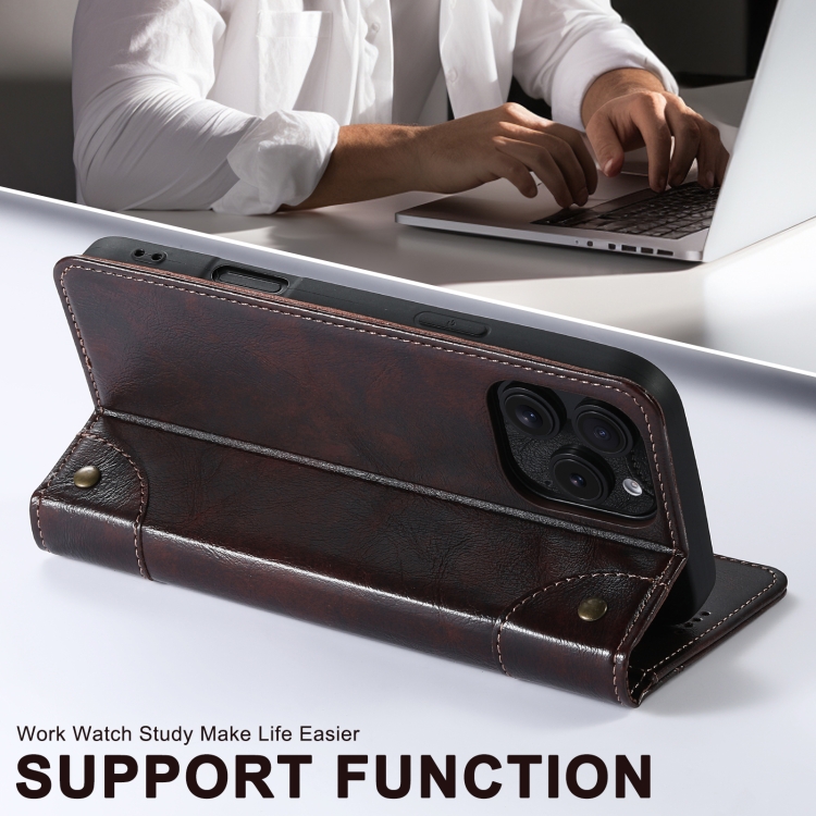 Funda Tipo Billetera Suteni para iPhone 16 Plus con Hebilla Textura Becerro (Marrón)