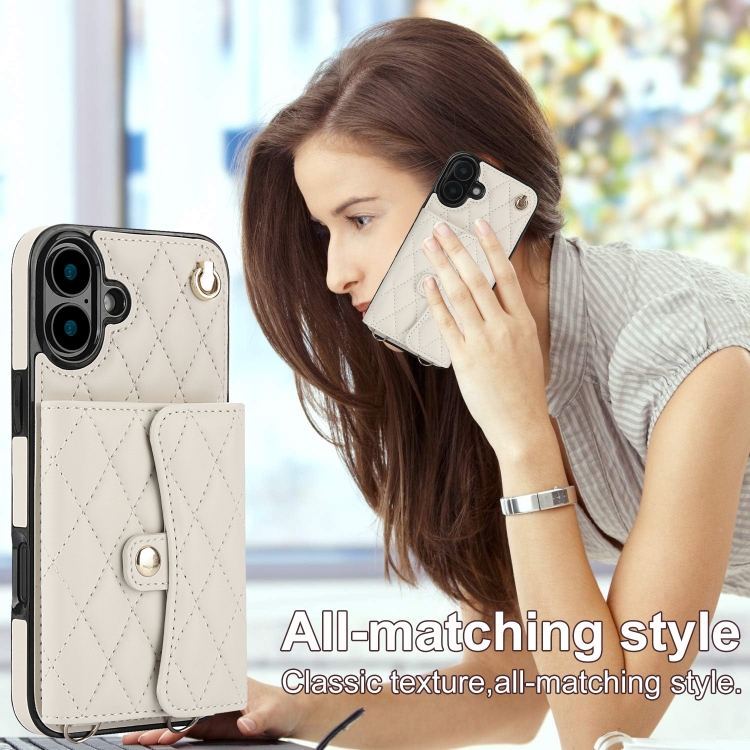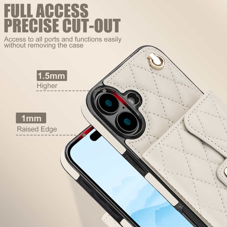 Funda Tipo Billetera Cuero con Diseño Rómbica y Bandolera para iPhone 16 Plus (Blanca)