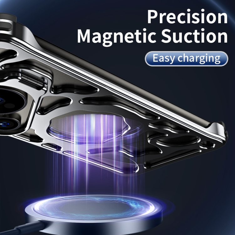 • Anillo de Lente abatible que funciona como Soporte, Panel Trasero hueco para disipación de calor, succión magnética para Carga Inalámbrica MagSafe, diseño micromate resistente a Huellas Dactilares