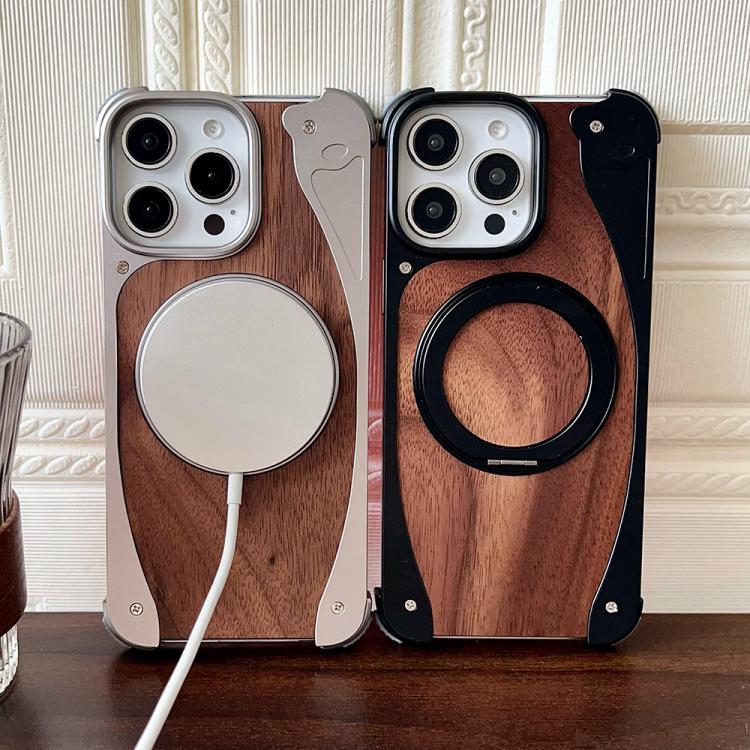 Funda de metal sin marco para iPhone 16 Pro, color nogal, con rotación de 360 grados y soporte MagSafe (negro)