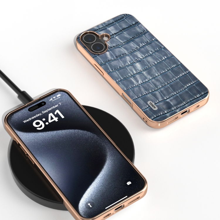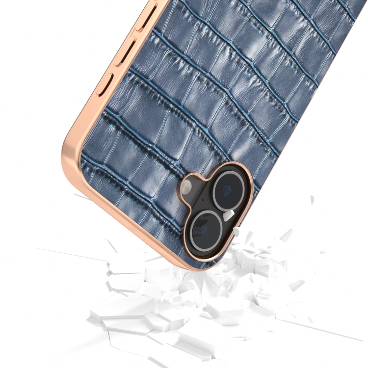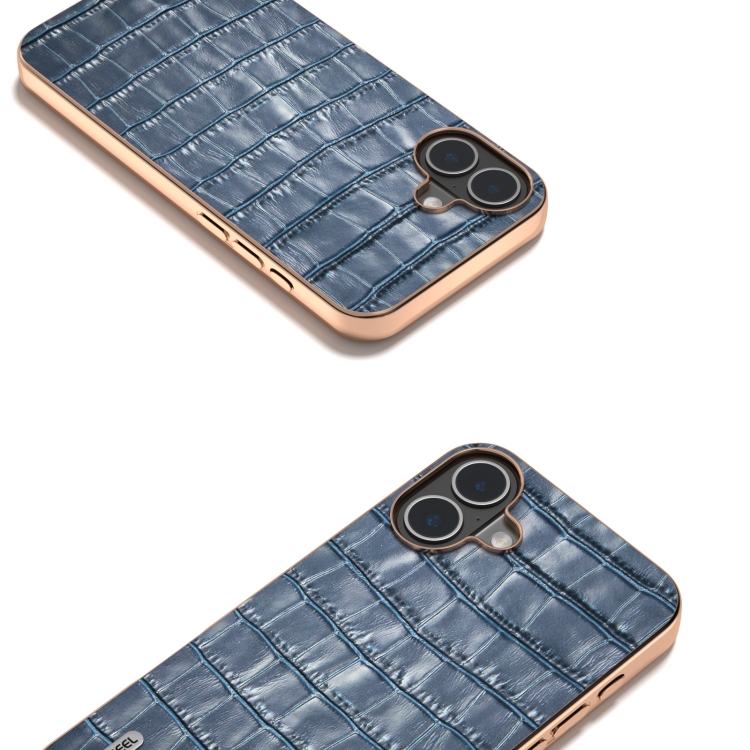 Funda de Piel Abeel para iPhone 16 Plus con Textura de Cocodrilo y Marco Galvanizado (Azul)