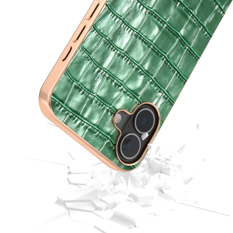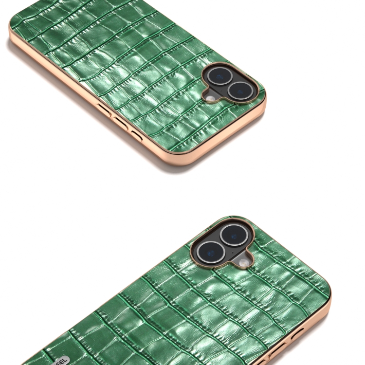 Funda Piel Auténtica Abeel iPhone 16 Plus Textura Cocodrilo Marco Galvanizado (Verde)