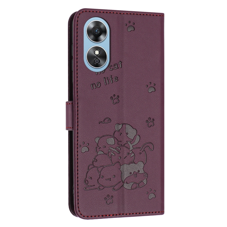 Funda de Piel con Diseño de Gatito En Relieve para Oppo A58 4G con Cordón (Rojo Vino)