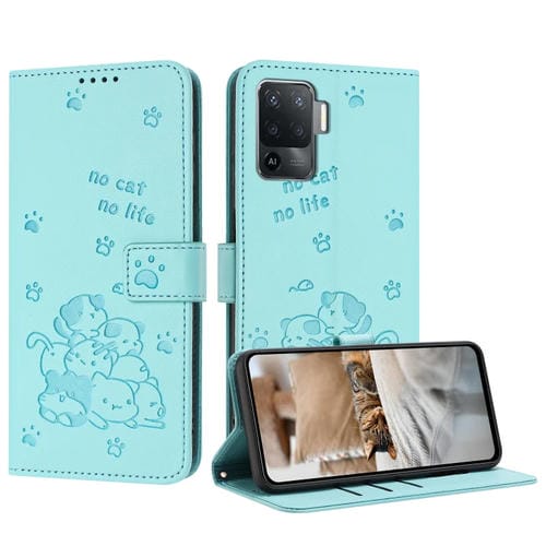 Funda de Piel con Diseño de Gatito En Relieve y Cordón para Oppo A94 4G / F19 Pro (Verde Menta)